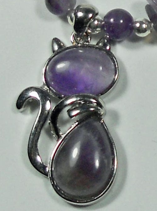 Amethyst Cat set in a silver plated cat setting pendant, which hangs on a necklace of Amethyst Gemstone Chips and clear seed beads and finished off with silver plated lobster clasp fasten, all findings are Nickel and Lead free.