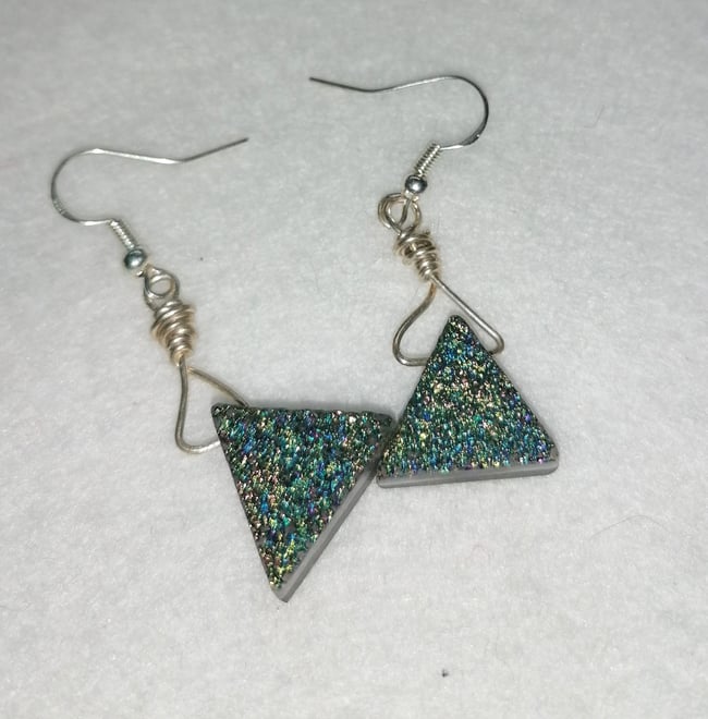 Green Druzy triangle beads, wire wrapped with sterling silver 0.8MM and hangs on sterling silver earring wire and your earrings will arrive to you in a lovely gift bag. Please note that there is a no returns policy on all earrings due to hygiene regulations.