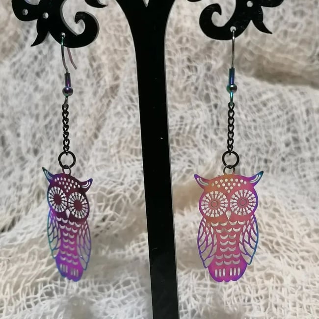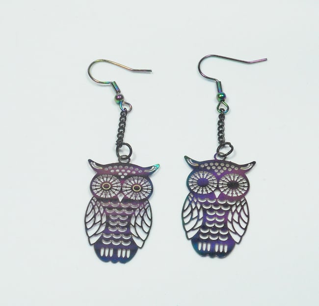 Rainbow plated surgical steel owl charms on hangs black chain and hangs on rainbow plated surgical steel earrings wire. Please note that there is a no returns policy on earrings, due to hygiene regulations.