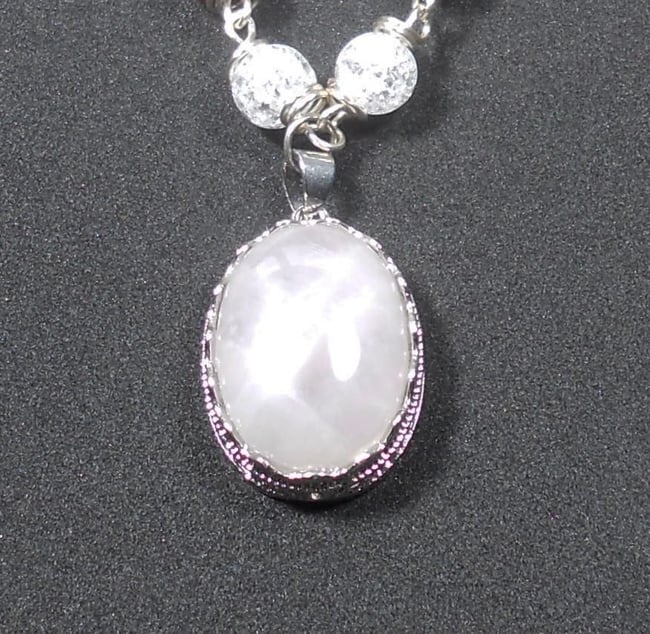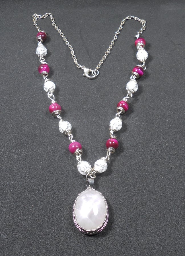 Rose quartz set in silver plated bezel pendant on a hand made on a wrapped looped links silver plated wire wrapped fuchsia Agate beads and clear crackled Quartz beads, that are connected onto silver plated chain and finished with silver plated lobster clasp fastening.
