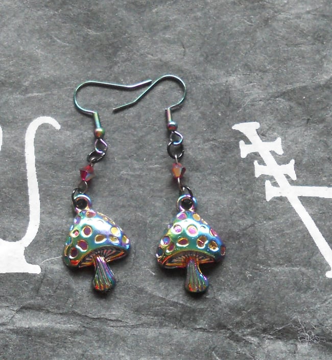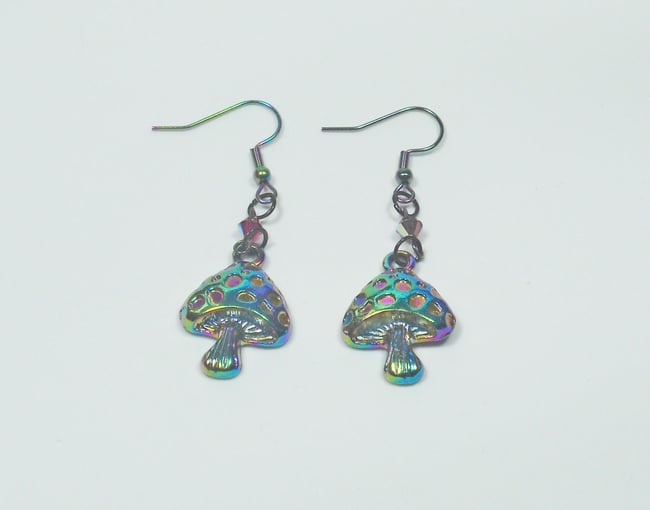 Rainbow plated surgical steel Toadstool charms on silver plated head pins with purple Austrian crystal beads and hangs on rainbow plated surgical steel earrings wire.