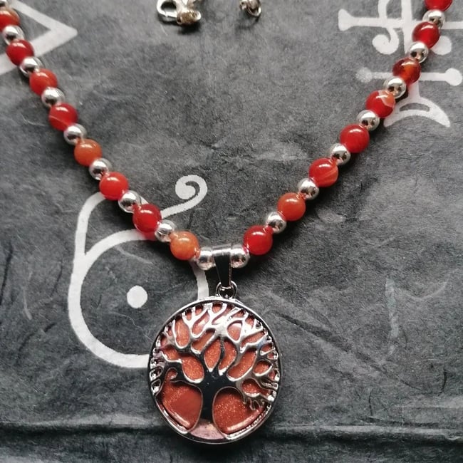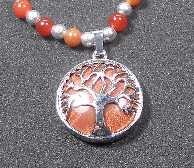 Silver plated tree of life with flat Goldstone cabochon and silver plated beads with orange Agate Gemstone beads and clear seed beads, all of the findings are Nickel and Lead free.